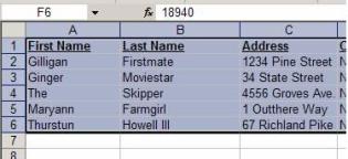 1) Highlight all the data you want to alphabetize. Don’t forget all the attached cells. For example if you have an address list and only highlight the names and not the addresses the names will be alphabetized and the addresses won’t move. In the example below I have correctly highlighted the data on my Gilligan’s Island address list: